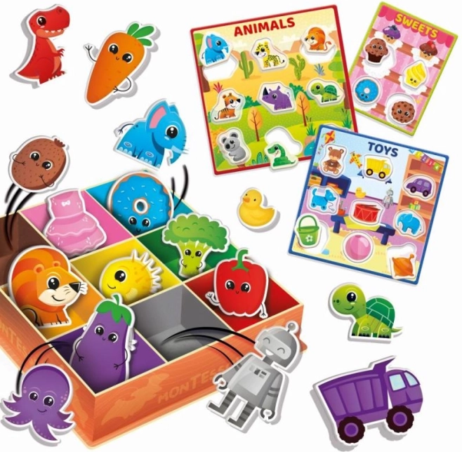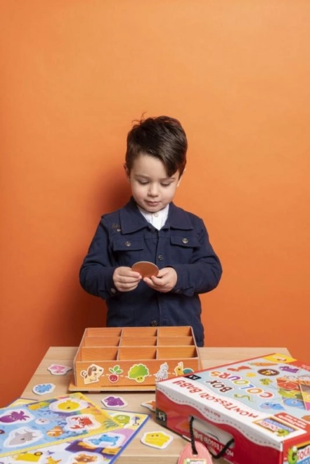 Tato barevná vkládací krabička vychází z principů metody MONTESSORI a vede děti k samostatnému objevování a třídění. Děti při hře vkládají a přiřazují prvky podle barev, čímž si nenásilně rozvíjejí smyslové vnímání, současně trénují soustředění a získávají radost z každého správného zařazení.