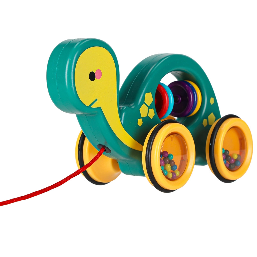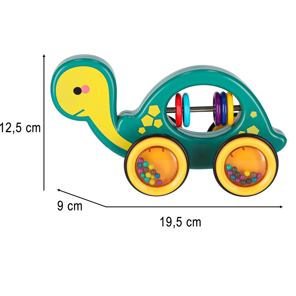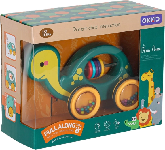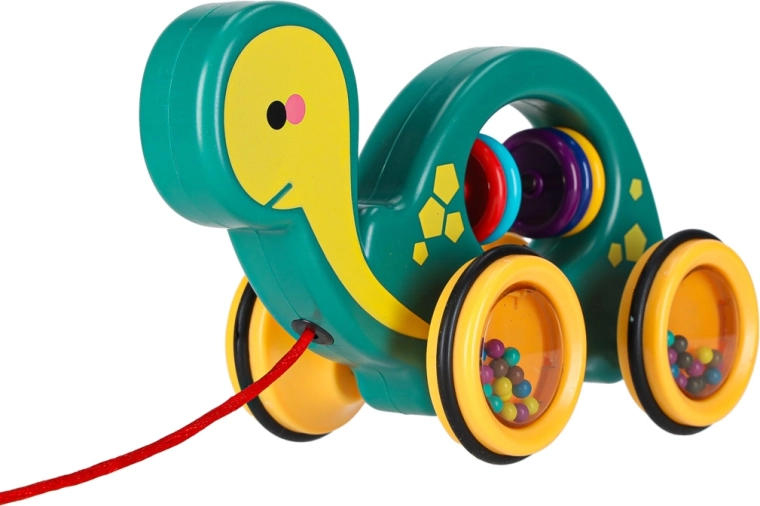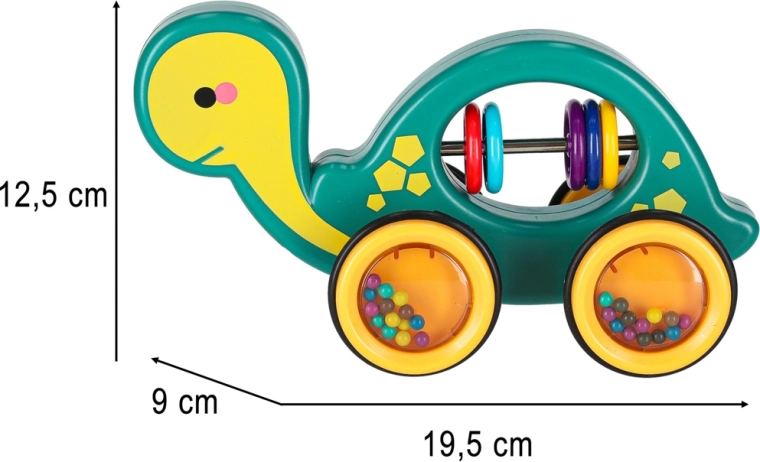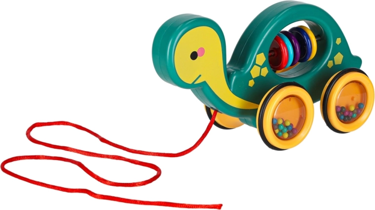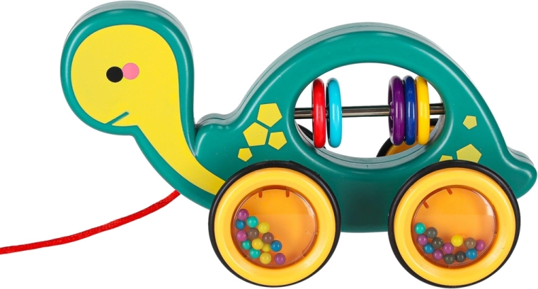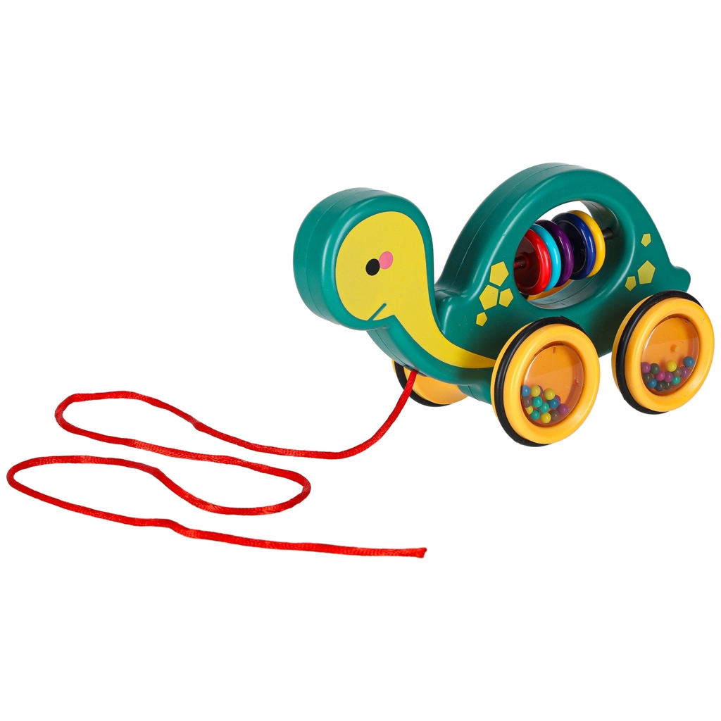 Tato veselá tahací želvička je perfektní kamarád na doma i na procházku. Díky šňůrce ji dítě snadno povede, zatímco průhledná kolečka s barevnými kuličkami příjemně chrastí a motivují k pohybu. Hračka podporuje rozvoj hrubé i jemné motoriky, koordinaci oko–ruka a vnímání příčin a následků.