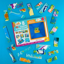 Progresivní puzzle CAROTINA Baby přinášejí dětem radost ze skládání od úplných začátků. Každá z 8 skládaček má jiný počet dílků a plynule zvyšuje náročnost, takže dítě přirozeně rozvíjí dovednosti bez frustrace. Tématické obrázky z prostředí mořského světa motivují k objevování a hraní.