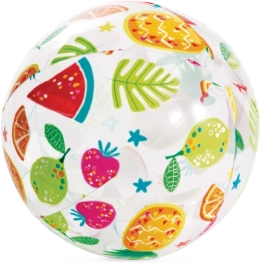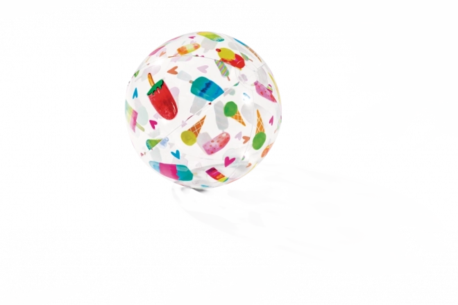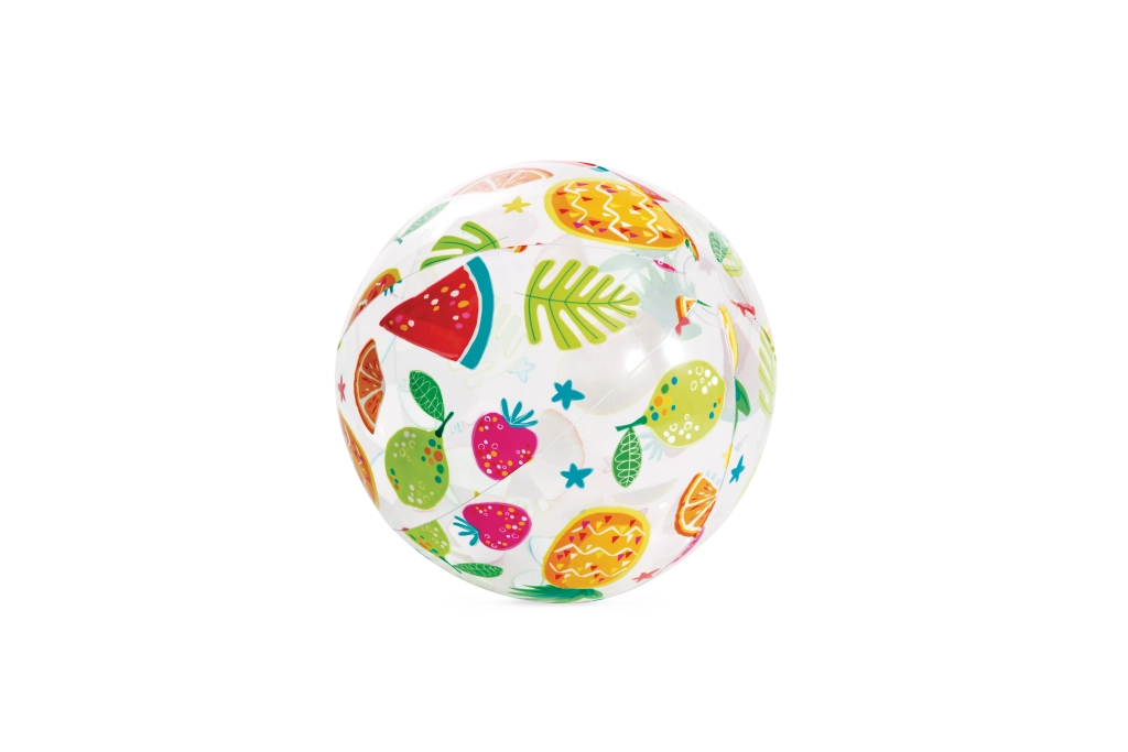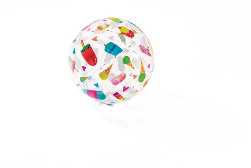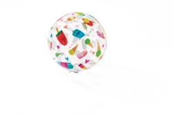 Transparentní míč zdobí barevné potisky ovoce, zmrzlin, rybek a mořských motivů. Motiv je vybírán náhodně, vždy ale zaručí veselý vzhled a dobrou viditelnost ve vodě i na pláži.