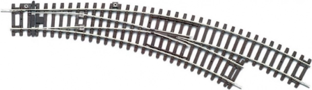 Detailní železniční výhybka Piko s reprodukcí dřevěných pražců ve věrných barvách a kombinací dvou 30° oblouků (R4/R3) pro směrování doprava. Ruční ovládání s možností připojení dálkově ovládaného přestavníku.