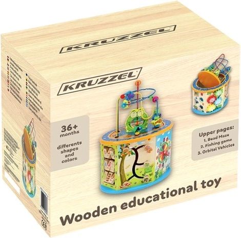 Tato dřevěná interaktivní kostka spojuje učení a zábavu v jednom. Dítě si procvičí počítání, rozlišování barev a tvarů, orientaci v čase na hodinách a koordinaci oko–ruka díky labyrintu s korálky a pohyblivým prvkům. Vesele ilustrované strany a pevné dřevěné provedení podporují kreativitu a bezpečnou hru.