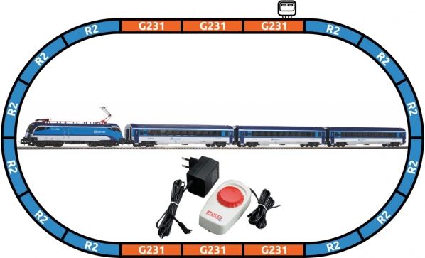- Obsah sady: elektrická lokomotiva ČD taurus (1×), osobní vůz 2. třídy ČD (3×), obloukové koleje R2 s podložím (12×), rovné koleje G231 s podložím (5× + 1× s napájecím připojením), napájecí svorka s podložím, základní analogový ovladač s napájecím zdrojem.