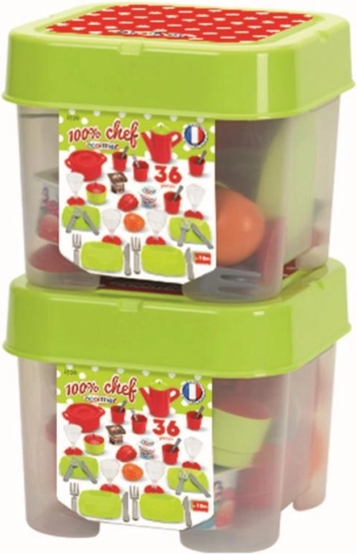 Kompletní jídelní set v boxu pro malé kuchaře obsahuje vše potřebné k servírování pohoštění. Najdete v něm talíře, příbory, pohárky, hrníčky, konvičku s víčkem, hrnec s víkem a také ovoce a jogurt. Skvělá volba pro rozvoj fantazie, role-play a jemné motoriky.