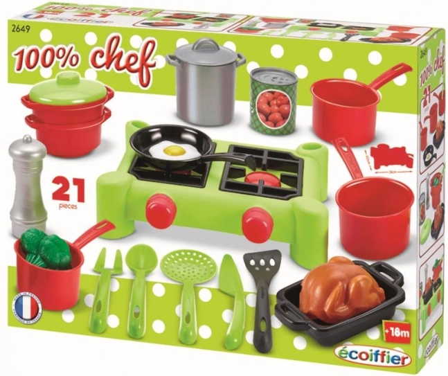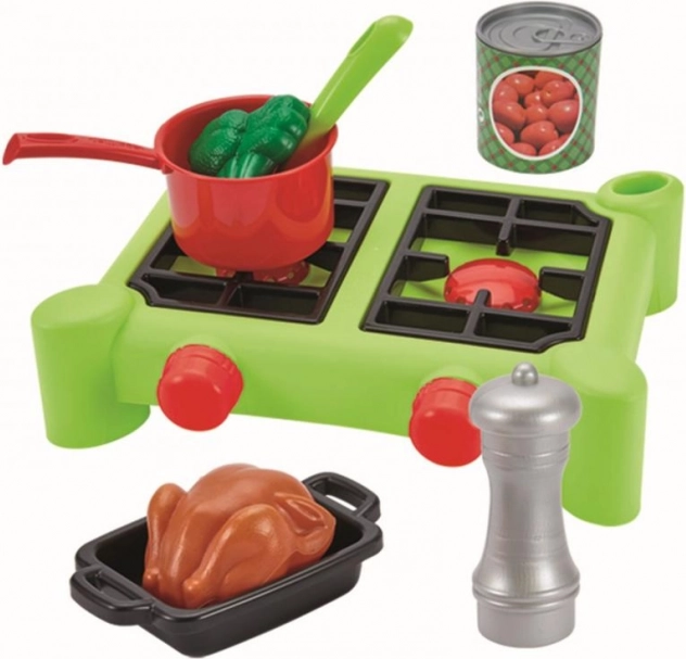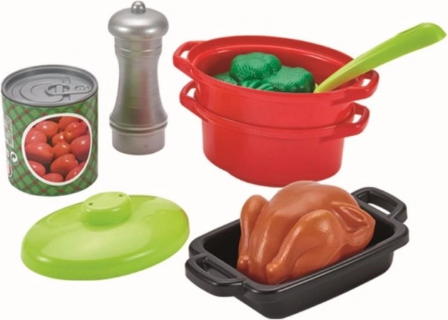 S touto kompletní sadou nádobí si děti mohou užít nekonečné hodiny vaření. Sada zahrnuje hrnce s pokličkami, rendlíky, pánvičku, pekáč a různé potraviny, které dodávají na realističnosti.