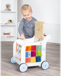 Chodítko kombinuje několik aktivit jako labyrint, skládanku a kreslicí tabulku, které podporují dovednosti dětí.