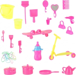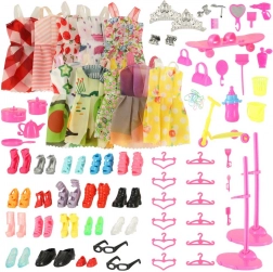 Tento megaset obsahuje zcela 85 prvků, včetně 10 barevných sukýnek a mnoho dalších atraktivních doplňků, jako jsou boty či korunky. Navíc je zde několik malých stojanů a ramínek pro snadnou organizaci šatníku panenek.