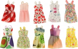 Set obsahuje 10 sukýnek pro panenky s různými vzory jako jsou proužky, květinové a abstraktní motivy.