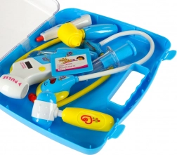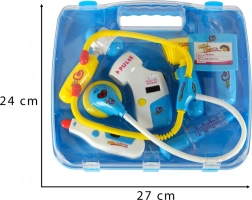 Součástí sady jsou lékařské nástroje jako stetoskop, teploměr, tlakoměr, nástroj na uši, stříkačka, kladívko, lékařský odznak a nástroj na kontrolu krku s osvětlením.