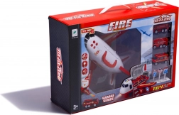 Součástí sady jsou 3 červená vozidla: hasičský vůz s žebříkem, obrněný transportér a městské zásahové auto + 7 dopravních značek. Praktické madlo na horní části usnadňuje přenášení i otevírání.