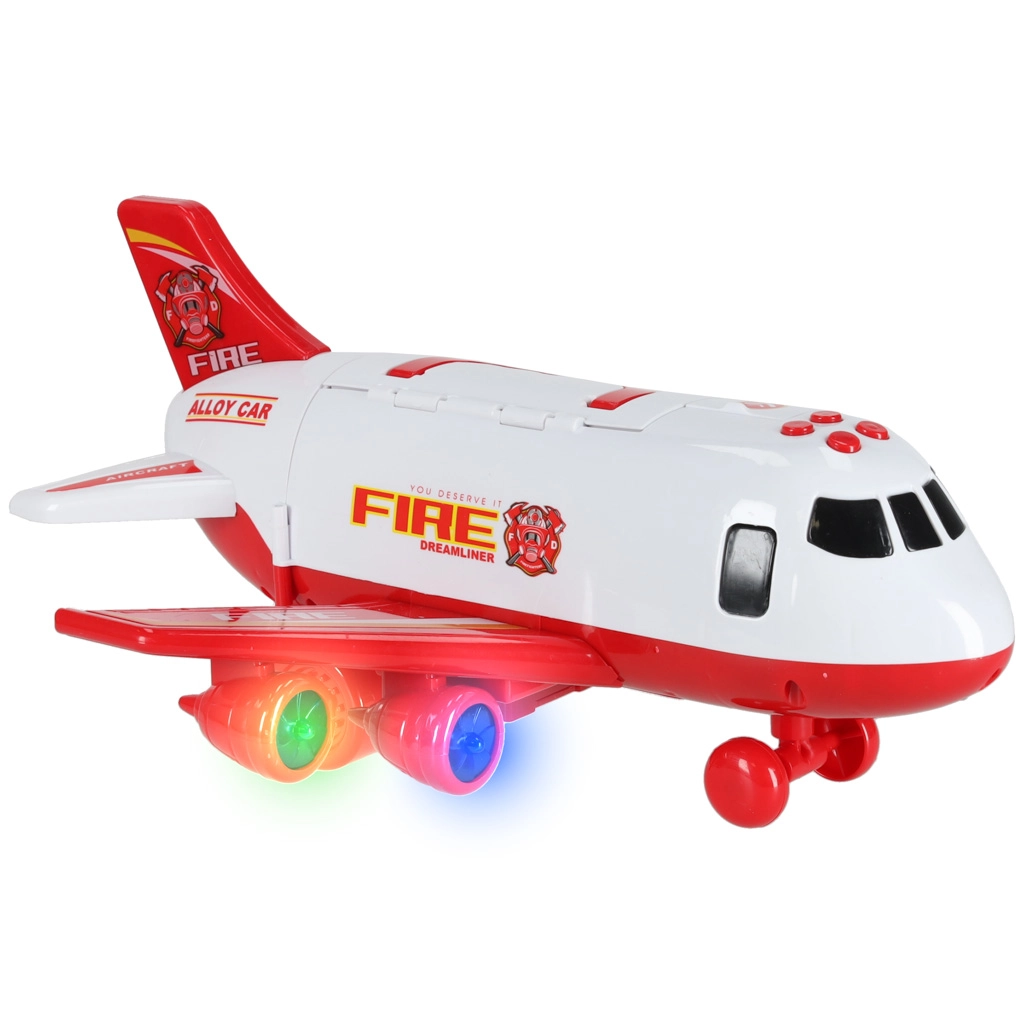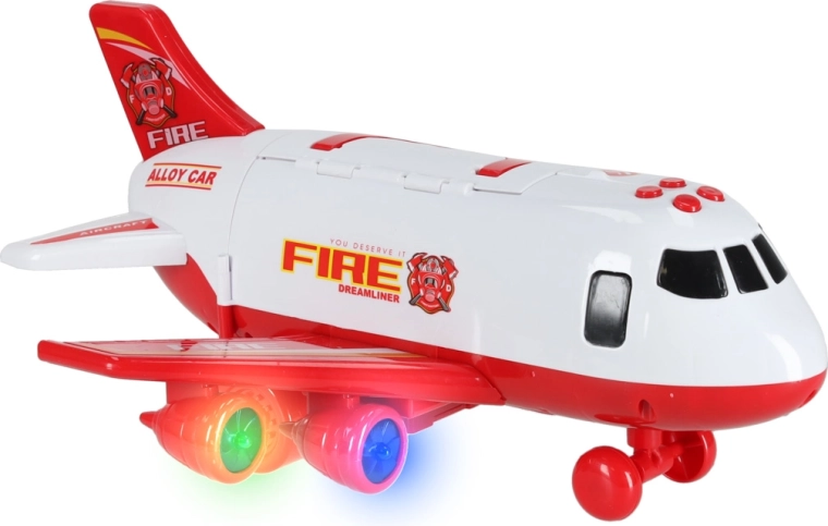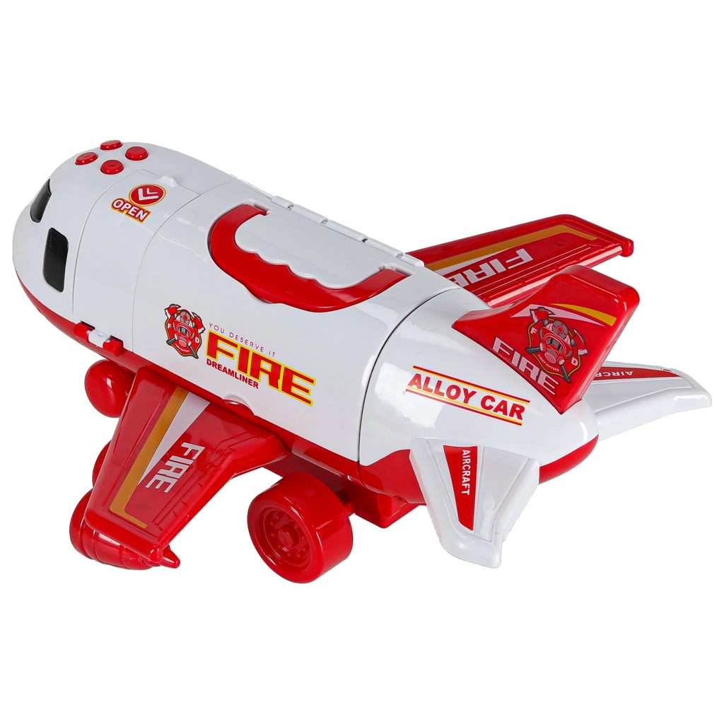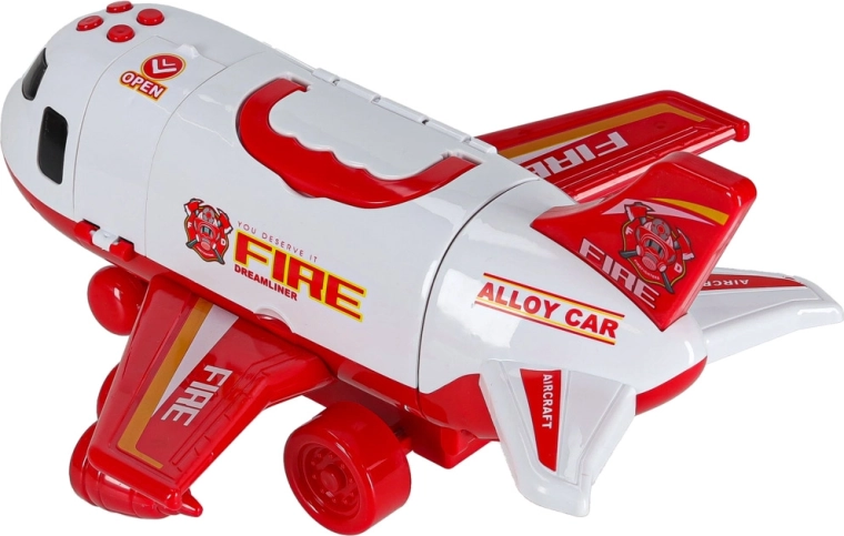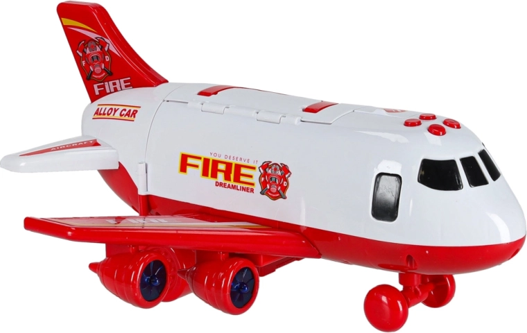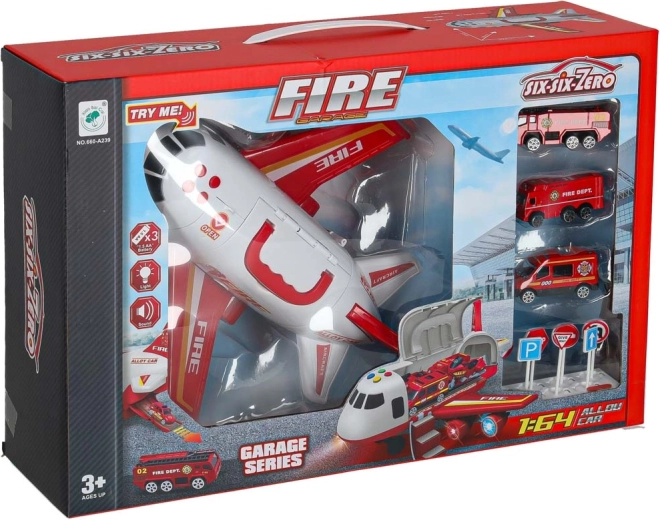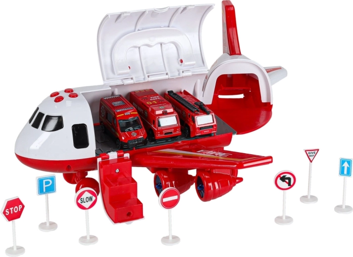 Součástí jsou 3 hasičská auta a sada 7 dopravních značek. Vše se vejde do útrob letadla, takže máte pořádek i připraveno na cesty.