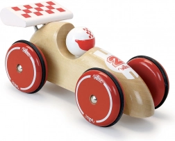 Toto dřevěné autíčko má design, který inspirovaly skutečné závodní vozy. Zářivé barvy a pečlivě zpracované detaily z něj dělají vizuálně atraktivní kousek.
