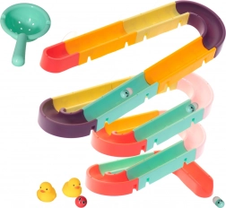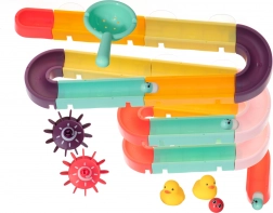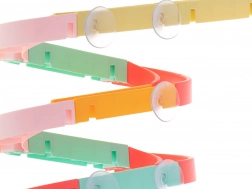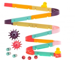 Každý den můžete vytvořit nový závodní okruh, kde se děti naučí nejen tvořit, ale i soutěžit ve veselých závodech s barevnými fazolkami a kuličkami. Skluzavka je vybavena přísavkami pro snadné upevnění na kachličky nebo vanu, což zajišťuje stabilitu během hry.