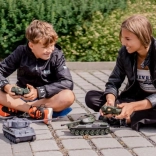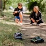 Současná jízda obou tanků bez překrývání signálu. Plynulé ovládání páčkami vpřed/vzad a přesné otáčení na místě.