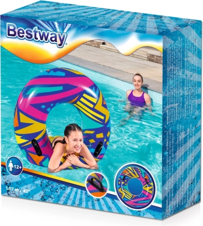 Užívejte si léto s nafukovacím kruhem Bestway o průměru 107 cm, ideálním pro teens i dospělé. Nabízí pohodlné držení díky dvěma úchytům, bezpečnostní ventily a výrazný geometrický design, který zaujme na pláži i u bazénu.