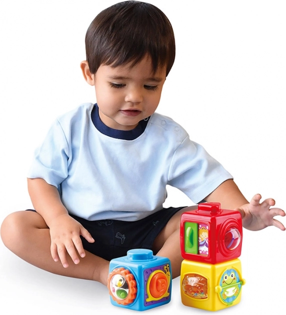 Děti se mohou učit a hrát si zároveň díky otočným a pohyblivým prvkům kostek, které podporují rozvoj jejich motorických schopností.