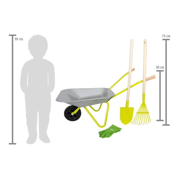 • Praktické rozměry: kolečko cca 79 × 36 × 50 cm, výška rukojetí 50 cm; délka lopaty a hrábí cca 73 cm.