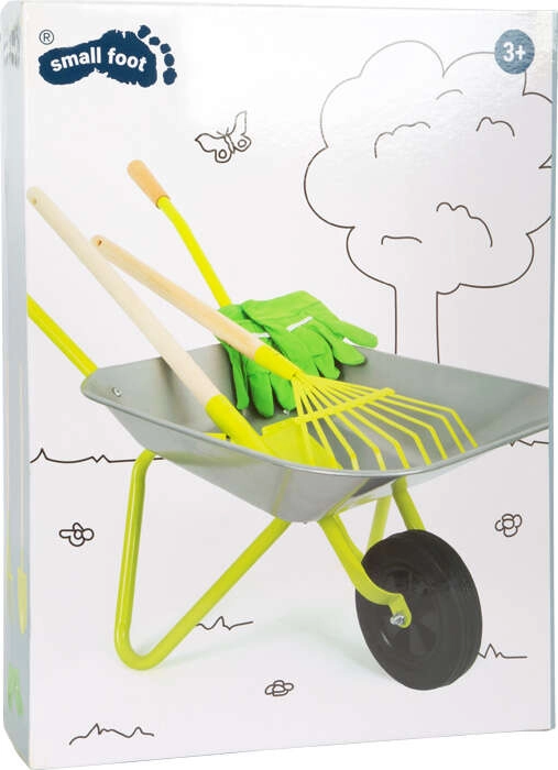 Objevte kvalitní dětskou zahradnickou sadu SMALL FOOT s kovovým kolečkem, lopatou, hráběmi a bavlněnými rukavicemi – ideální pro malé pomocníky na zahradě. Sada je vyrobena převážně z kovu, je robustní, bezpečná a nabízí skvělou zábavu při skutečných zahradnických pracích. Stabilní kovové provedení, kolečko cca 10 l / nosnost do 15 kg a ergonomické dřevěné rukojeti podporují snadnou manipulaci a rozvoj dovedností dětí.