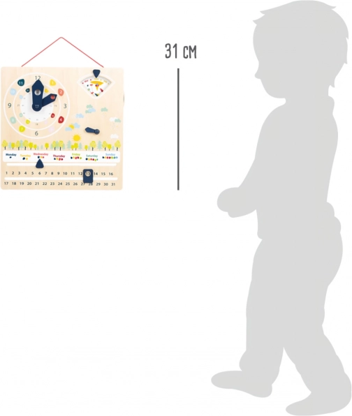 Přehledná dřevěná tabule kombinuje hodiny, kalendář a ukazatele počasí. Barevné prvky a jasné piktogramy usnadňují pochopení a podporují zábavné učení každý den.