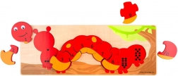 Počítací puzzle housenka BIGJIGS TOYS propojuje učení s hrou. Děti skládají číslované dílky 1–10 na dřevěnou podložku s černými tečkami, které odpovídají číslu na dílku. Tím si upevňují porozumění množství, barvám a tvarům, a zároveň trénují koordinaci oko–ruka.
