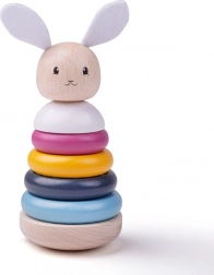 Tato kvalitní dřevěná nasazovačka v pastelových barvách je ideální první vzdělávací hračka. Děti skládají kroužky od největšího po nejmenší, posilují koordinaci oko–ruka a učí se rozlišovat barvy i tvary. Textilní ouška a ocásek zajíčka přidávají hmatový rozměr hry.