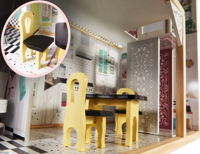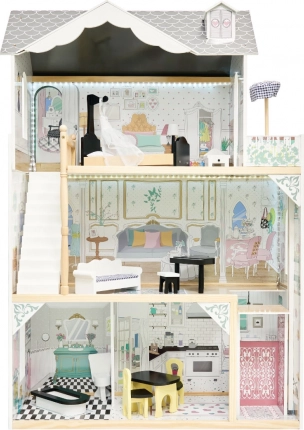 Dřevěný domeček pro panenky se vyznačuje moderním stylem a splní sny každého dítěte. Obsahuje 4 samostatné místnosti, balkon a výtah. Je plně vybaven krásným dřevěným nábytkem, který dokonale doplní každý pokoj v domečku.