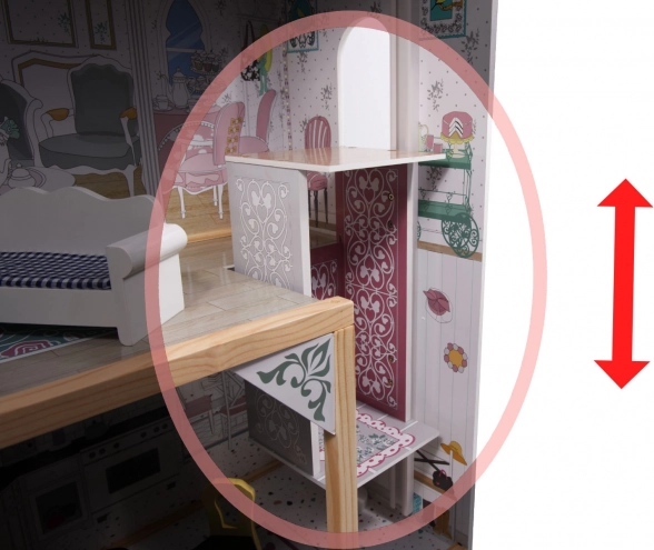 Domeček má 3 podlaží a obsahuje 4 samostatné místnosti, balkon a výtah, umožňující hrát s více panenkami.