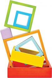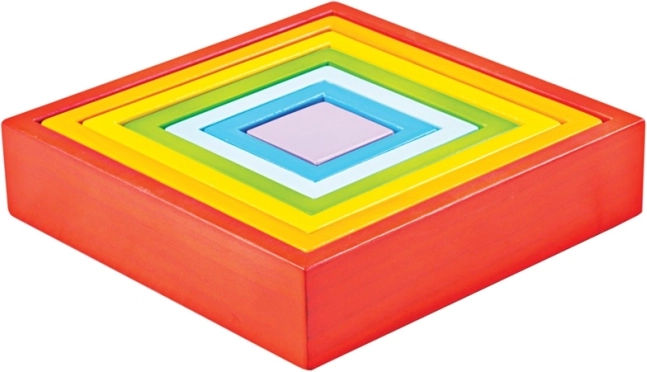 Duhová paleta a postupně se zmenšující čtverce vedou děti k rozlišování barev, velikostí a tvarů. Ideální pro první třídění a pojmenovávání.