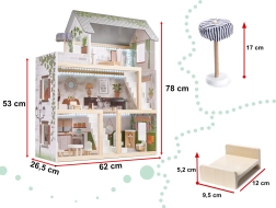 Dřevěný domeček pro panenky LULILO Floro je vytvořen ve stylu boho, což jej činí nejen krásným, ale i funkčním. S jeho třemi podlažími a prostornou terasou nabízí dostatek prostoru pro různé scénáře a hry. Domek je vybaven čtyřmi místnostmi: kuchyní, koupelnou, obývacím pokojem a ložnicí, kde naleznete každou místnost bohatě vybavenou jako v skutečném domově.
