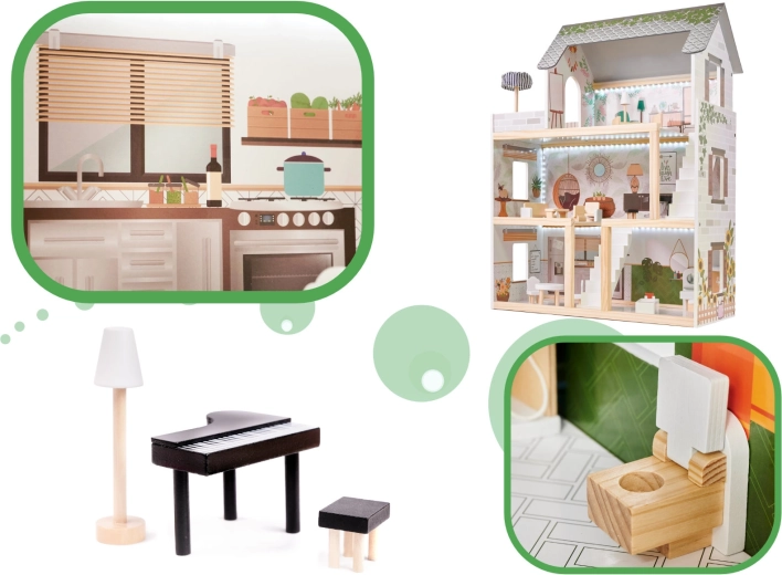 Objevte kouzelný svět boho s dřevěným domečkem pro panenky LULILO FLORO o výšce 78 cm. Třístupňová konstrukce s terasou, detailními doplňky a LED osvětlením vytváří útulnou atmosféru pro hodiny kreativní a představivé hry. Pečlivě broušené dřevo, pastelové barvy a bohatá výbava z něj dělají krásnou dekoraci dětského pokoje i dokonalý dárek.
