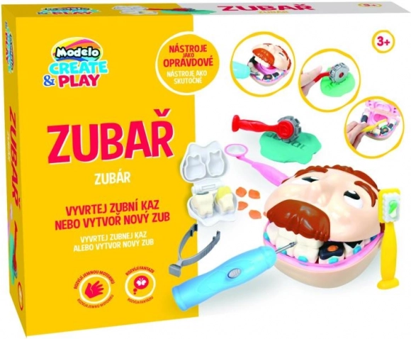 Sada Modelo Zubař přináší dětem hravou a poučnou zábavu. Díky realistickým nástrojům a barevné modelíně si mohou vytvořit vlastní zubní ordinaci, léčit kazy, dělat plomby i nasazovat rovnátka. Modelína je příjemná na dotek, dobře drží tvar, nešpiní a nevysychá.