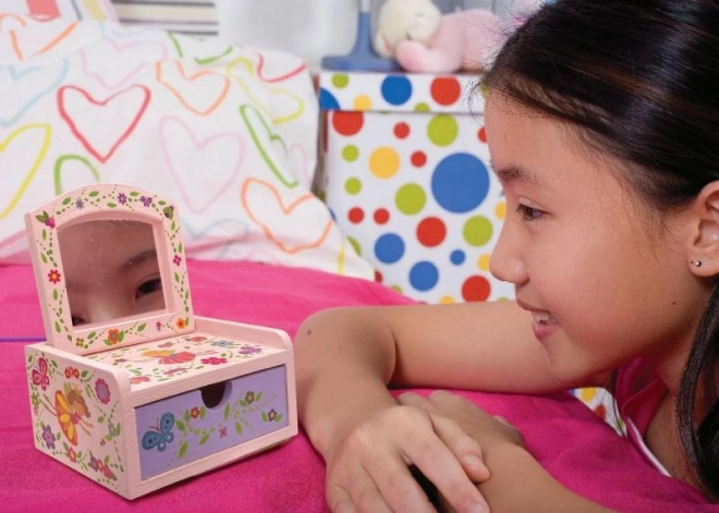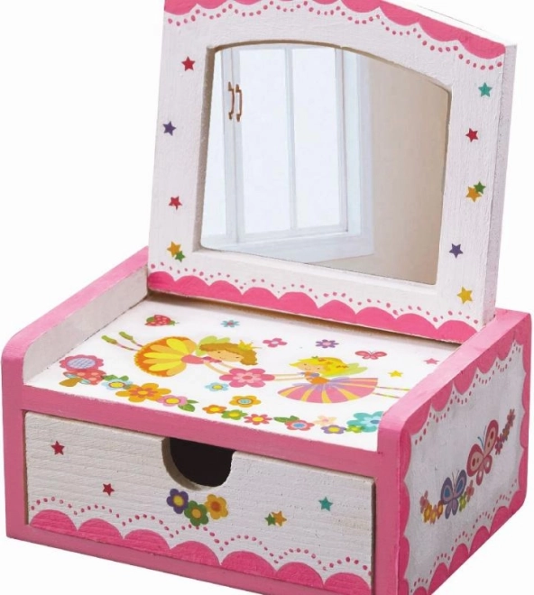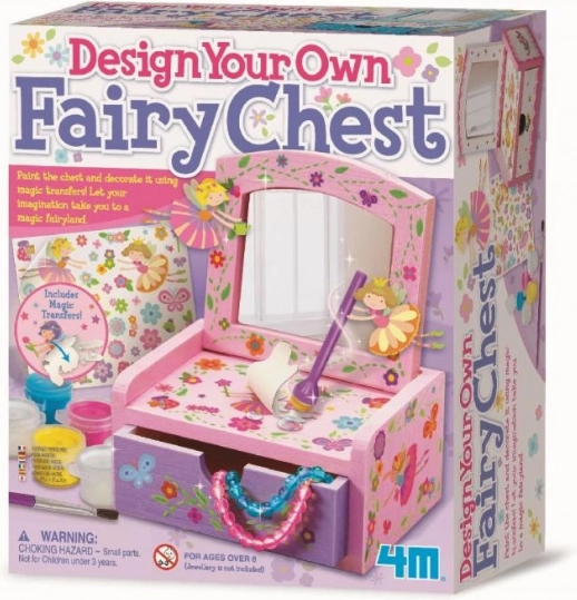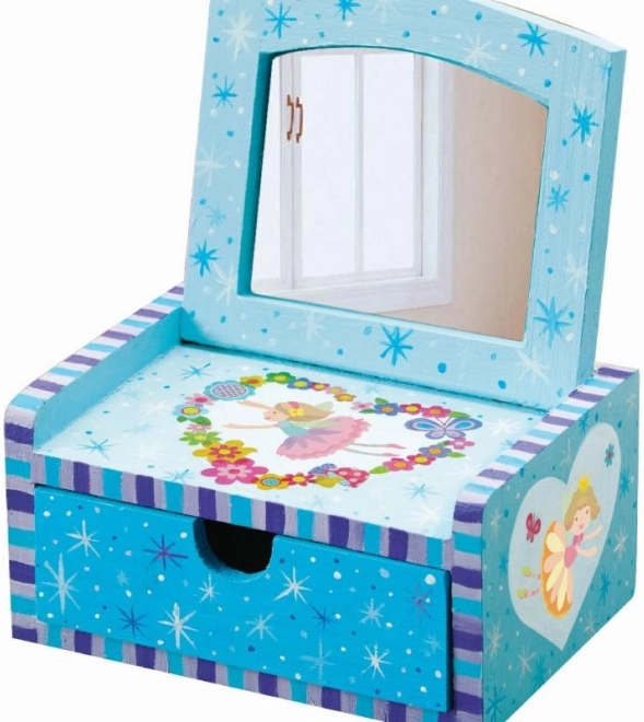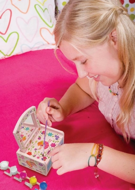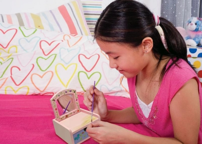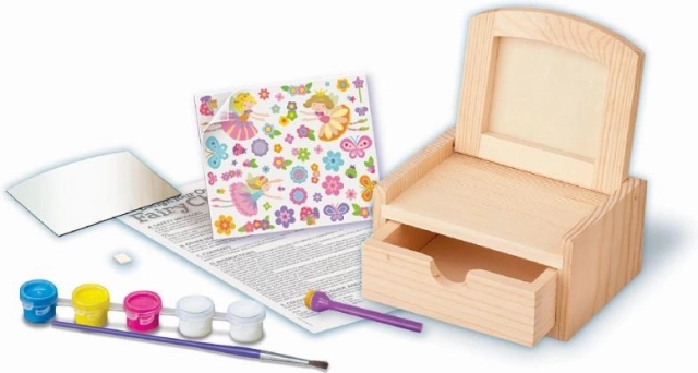 Proměň jednoduchou dřevěnou truhličku v kouzelnou šperkovnici s vílami, květinami a motýly. Sada obsahuje barvy, štětec a samolepky, takže si snadno vytvoříš svůj originální design. Praktické vnitřní zrcátko a spodní šuplík se postarají o bezpečné uložení drobností.