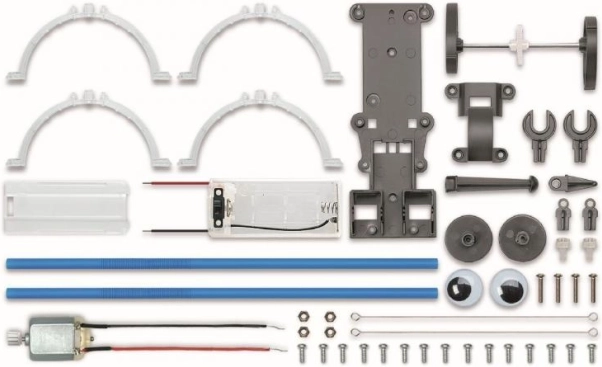 Motor a držák, převody, rám/šasi, kola a díly podvozku, šroubky a matičky, ohebné ruce, oči, ilustrovaný návod