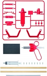 Plastové díly, dřevěné tyčky, stříkačky a hadičky pro hydrauliku, spojovací materiál, návod k sestavení