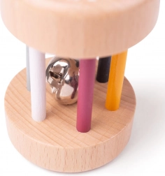 Děti mohou toto chrastítko nejen třást a chrastit, ale také kutálet po povrchu. Díky barevným sloupečkům v 6 různých odstínech a lesklé rolničce uprostřed rozvíjí chrastítko koordinaci ruka-oko. Je odolné a lehké, což zajišťuje pohodlné uchopení.