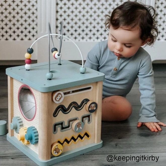 Objevte všestrannou motorickou kostku z kvalitního 100% FSC dřeva, která děti zabaví na dlouhé hodiny. Na každé straně čeká jiná aktivita – vkládačka, kuličková dráha, ozubená kolečka a další. Kombinace přírodního dřeva a jemných pastelových barev je ideální pro kluky i holky. Hračka podporuje rozvoj motoriky, komunikace a rozpoznávání čísel a je bezpečná pro děti díky šetrným materiálům s certifikací FSC.