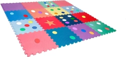 Živé barvy a tvary (puntíky, hvězda) podporují smyslové vnímání a rozvoj jemné i hrubé motoriky. Pěna tlumí nárazy a chrání před chladem podlahy.