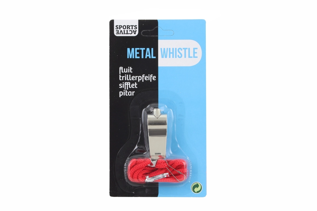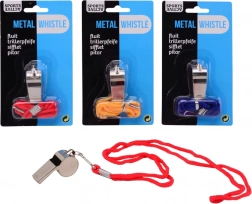 Univerzální kovová sportovní píšťalka s praktickým řemínkem na krk a karabinkou pro snadné připnutí. Ideální pro trenéry, rozhodčí, učitele i organizátory akcí. K dispozici jsou řemínky ve třech barvách: modrá, červená a žlutá. Díky kovovému tělu je píšťalka odolná, má silný a čistý tón a pohodlné nošení díky řemínku.