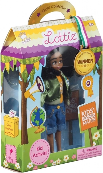 Lottie Aktivistka Meg je malá, ale odvážná hrdinka, která inspiruje děti k sebevědomí a vyjadřování vlastních názorů. Její outfit odkazuje na občanskou angažovanost – žluté tričko s nápisem „Kids Voices Matter“, zelená bunda s plackou „Stand Up“, džínové šortky a bílé tenisky.