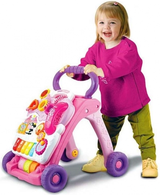 Děti se seznamují se zvířátky a jejich zvuky, barvami, tvary a čísly. Otočná ozubená kolečka, barevné piáno či telefonní sluchátko podporují zvídavost, koordinaci oko–ruka a manuální dovednosti. Stabilní konstrukce, ergonomická rukojeť a možnost nastavení brzdění koleček přinášejí potřebnou jistotu při prvních krůčcích.