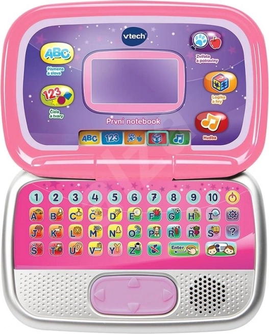 Vtech první notebook přináší dětem svět učení i zábavy v podobě sklápěcího „notebooku“ uzpůsobeného dětským rukám. Děti se hravou formou naučí velká i malá písmena, jejich výslovnost a použití ve slovech, procvičí počítání do deseti, porovnávání, rozpoznávání tvarů, zvířecích stop i zvuků. Vtipný tučňák provází aktivitami a pomáhá osvojit prostorové pojmy jako před, pod, nad, vedle či za.