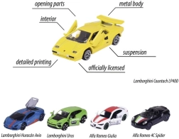 V balení najdete výběr legendárních vozů: ALFA ROMEO 4C Spider, LAMBORGHINI Countach LP 400, LAMBORGHINI Huracán Avio, LAMBORGHINI Urus a ALFA ROMEO Giulia. Díky kloubovým částem a funkčnímu zavěšení je jízda plynulá a realistická. Perfektní pro děti od 3 let i jako stylový doplněk do sbírky.