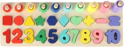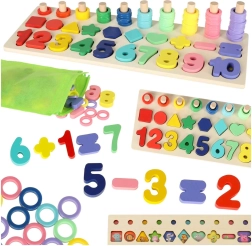 Tato montessori sada spojuje radost ze skládání s učením. Děti přiřazují dřevěné geometrické tvary a čísla do správných otvorů a zároveň na kolíky navlékají barevné kroužky, jejichž počet odpovídá dané číslici. Díky přehledné dřevěné základně je učení přirozené a zábavné.
