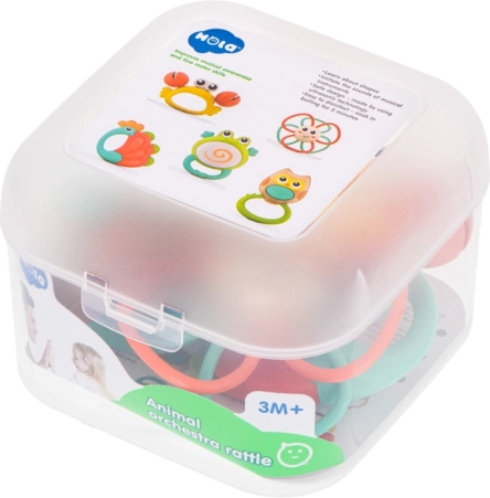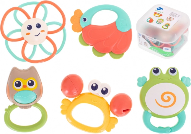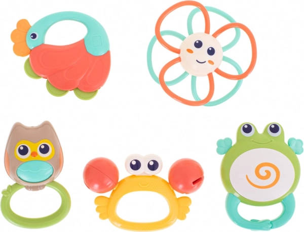 Krásná sada chrastítek pro nejmenší děti. Sada nabízí pět kusů chrastítek s motivem zvířátek, každé nabízí něco jiného. Všechna jsou anatomicky navržená tak, aby dobře padla dítěti do ruky a zaujala svým specifickým zvukem. Chrastítka jsou dodávána v praktické krabičce, do které po hře vždy můžete všechna zase uschovat.