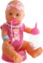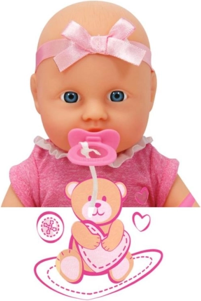 Panenka je oblečená v růžových šatičkách s potiskem medvěda a mašličkou. Je oblíbeným společníkem pro každý den.