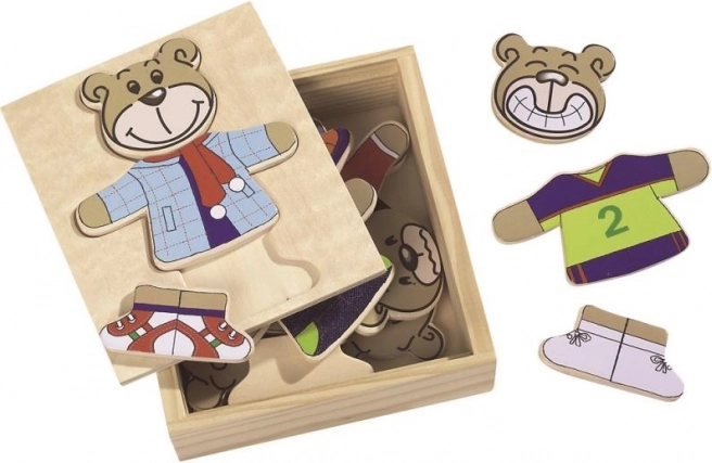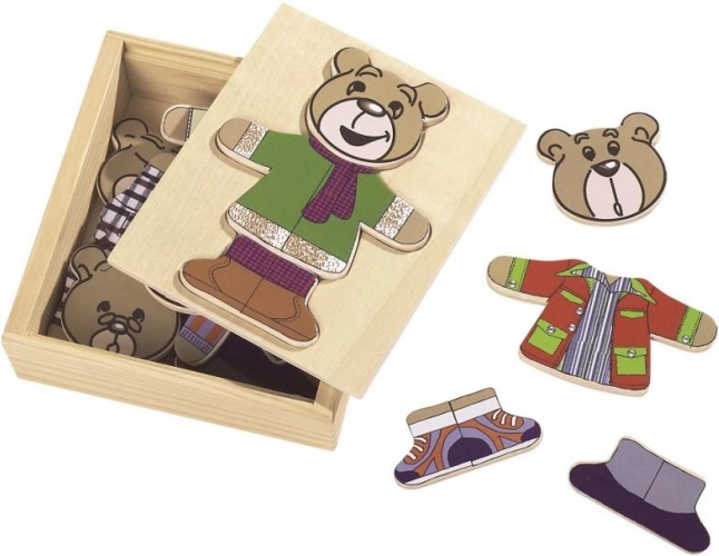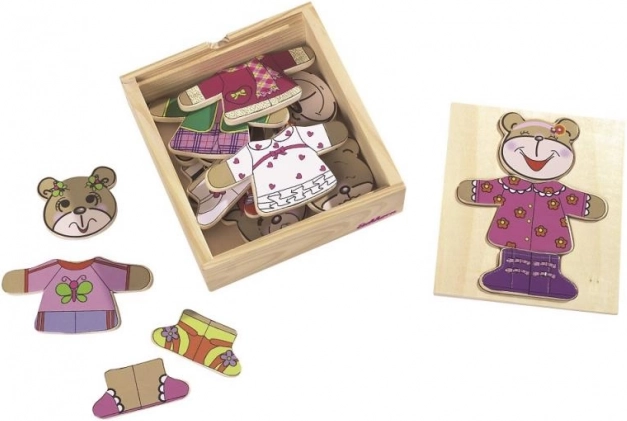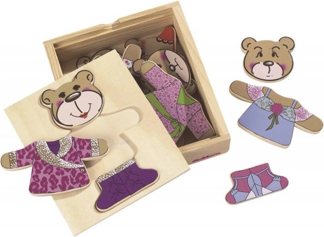 Oblékni si svého medvídka s touto zábavnou skládačkou! Obsahuje 20 dílů a přichází v praktickém dřevěném boxu.