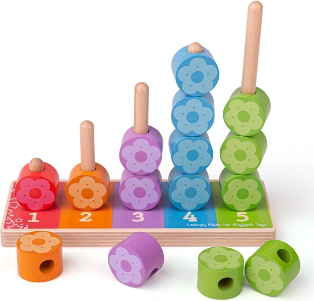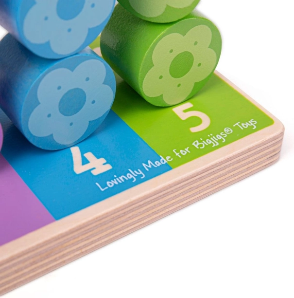 Každý sloupek má svůj počet a barvu, takže děti snadno pochopí princip párování a počtu. Květinkové dílky se pohodlně drží i malým ručkám a motivují k samostatné hře i společnému objevování s rodiči.