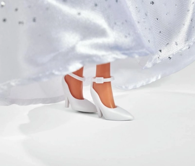 Šaty se stříbrnými třpytkami a jemné bolerko z panenky dělají skutečnou princeznu. Ideální pro slavnostní příběhy i vystavení v pokojíčku.