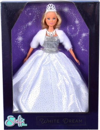 Nechte zazářit fantazii s panenkou STEFFI LOVE – Bílý sen. Okouzlí nádhernými bílými šaty s třpytkami, jemným kožešinovým bolerkem a stylovými doplňky. Tato princezna inspiruje k příběhům plným elegance a radosti a podněcuje kreativní hraní rolí.
