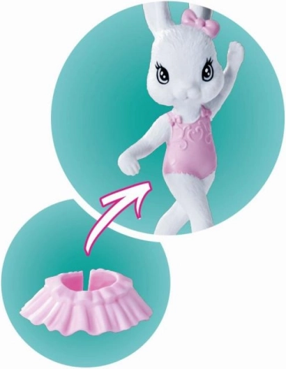 Díky pohyblivým kloubům v loktech a zápěstích lze panenku snadno nastavit do klasických baletních pozic. Součástí je i malý králíček – balerína, který rozšíří herní scénáře a podpoří fantazii.